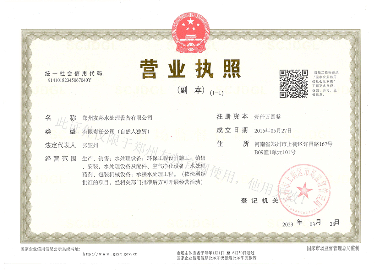 鄭州友邦水處理設備有限公司——營業(yè)執(zhí)照